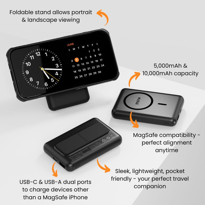 Both models also feature a sleek and compact design with a foldable stand, perfect for watching videos or taking video calls in portrait or landscape mode. Plus, with dual output USB-C and USB-A ports delivering up to 20W of wired power, you can keep your non-iPhone friends charged up too. Grab an EFM FLUX today and enjoy true freedom from low battery anxiety, with a capacity that's just right for you!